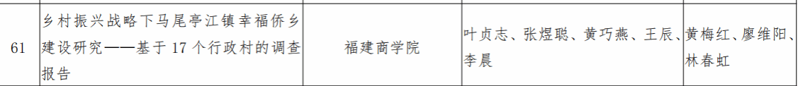 近日,第十六届“挑战杯”福建省大学生课外学术科技作品竞赛落下帷幕,beat365vip官网登录入口项目《乡村振兴战略下马尾亭江镇幸福侨乡建设研究——基于 17 个行政村的调查报告》(项目成员:21级日语3班叶贞志、21级日语2班张煜聪、20级日语2班黄巧燕、20级日语1班王辰、20级商务英语2班李晨,指导老师:黄梅红、廖维阳、林春虹),在全省61所高校1343件作品中脱颖而出,荣获三等奖。据悉,这是beat365官网学生首次在“挑战杯”福建省大学生课外学术科技作品竞赛中获奖,实现了在“挑战杯”比赛上的重大突破。