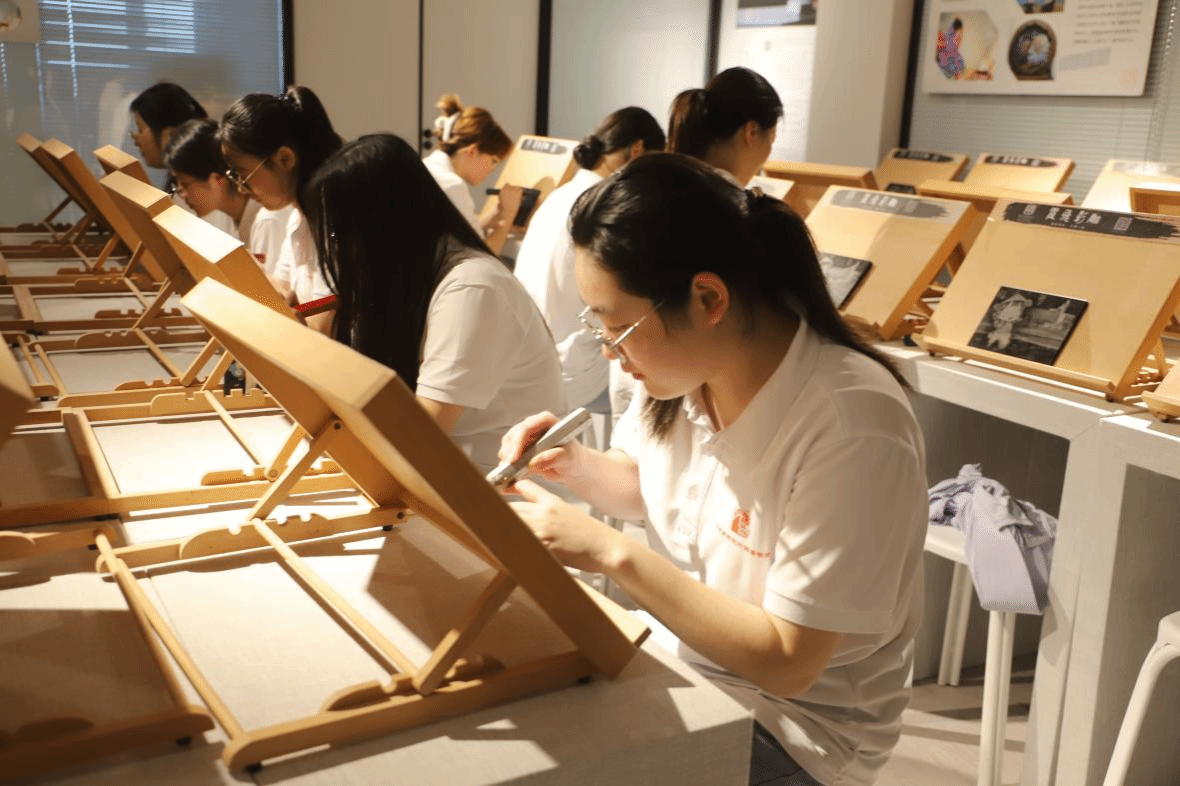 实践队在霞飞雕刻艺术馆亲身体验影雕技艺。在影雕工匠的指导下,队员们学习了影雕的基本原理和技法,并在亲自实践感受这一技艺的精妙。队员们在刻刀与石板的碰撞中,逐渐掌握了影雕的基本技巧。他们时而凝神聚气,小心翼翼地控制刻刀的力度和角度;时而眉头紧锁,反复揣摩线条的深浅和粗细。