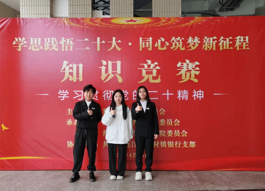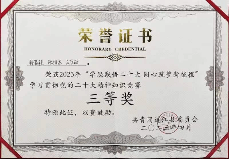 2023年4月25日,由共青团连江县委员会主办,共青团beat365vip官网登录入口委员会、共青团福州理工学院委员会承办,beat365vip官网登录入口学生协办2023年的“学思践悟二十大,同心筑梦新征程”学习贯彻党的二十大知识竞赛决赛于连江校区明德楼学生活动中心举行。由beat365vip官网登录入口20级商务英语3班张雅龙,21级商务英语2班林嘉颖,21级日语1班吴欣雨三位同学组成的beat365vip官网登录入口第一代表队在竞赛中沉着冷静、协助作答,最终荣获三等奖的好成绩。