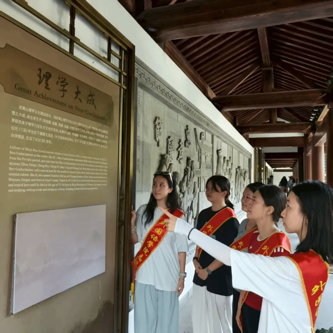 为了让参观者更直观地感受当年的讲学氛围,武夷精舍内还精心布置了书院场景。实践队围坐书桌前,听着当地向导讲述朱子生平与理学脉络,仿佛穿越时空回到了那个学术繁荣的年代,看见朱熹同弟子们围坐论道的画面:他们或执经叩问,或激辩往复。而理学的种子,便在这一次次的研讨与传习中,悄然播向更辽远的时空……