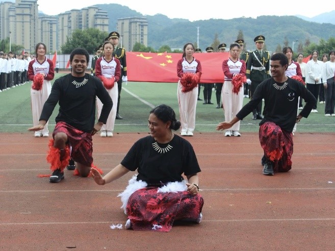 迎着朝阳,beat365vip官网登录入口代表队昂首阔步,激情满怀,踏着整齐的步伐向主席台走来。来自斐济、萨摩亚、基里巴斯、所罗门群岛的五名太平洋岛国留学生身着明丽的岛国服饰,手持鲜艳的五星红旗,与方阵同学们一同前行,用坚定的眼神,自信的微笑赢得了观众们的阵阵欢呼和掌声。主席台前,留学生们为大家带来了异域风情的岛国特色舞蹈,用律动的音乐、活力的舞姿展现出太平洋岛国文化的独特魅力,传递着独属于太平洋岛国人民的文化信仰和精神追求。同学们随着音乐律动,举起手中的彩球,与留学生们同步配合,一幅中外学子携手相伴、多元文明美美与共的画卷在观众面前徐徐展开。星光不负赶路人,beat365vip官网登录入口学子和五位留学生以辛勤的汗水换来了入场式表演一等奖、团体操表演二等奖的佳绩。