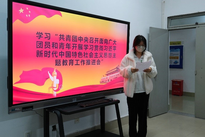 青年代表陈锦义同学以自身情况为切入点进行分享,他表示此次主题教育会议推进了团员和青年对四个专题的学习,加深了他对习近平总书记关于青年工作重要思想的理解,明确了思想旗帜,同时作为新时代青年应坚强核心,勇担责任,发挥团员、青年的模范带头作用,提高服务意识。郭文静同学通过学习会议内容发表感悟,她认为广大青年要加强理论知识的学习,提升自身素养,坚持理论联系实际,学以致用,并形成自己的思维方式和思想体系,与时俱进地分析新情况、解决新问题、打开新局面。在场的同学们一致表示作为后继者,当勤勉以赴,挺膺担当,共筑强国复兴路。