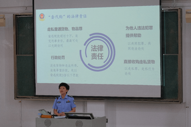 为深入贯彻落实法治精神,拒绝“套代购”,2024年5月21日beat365vip官网登录入口邀请马尾海关缉私分局四级高级警长薛丹果入校,开展了“打击利用海南离岛免税政策实施‘套代购’走私”普法宣传讲座。beat365vip官网登录入口在校生参加本次讲座。