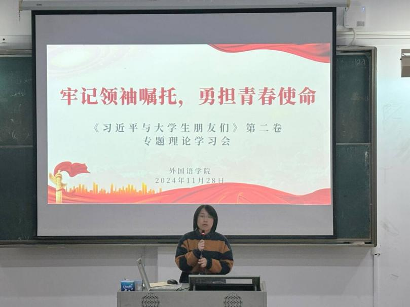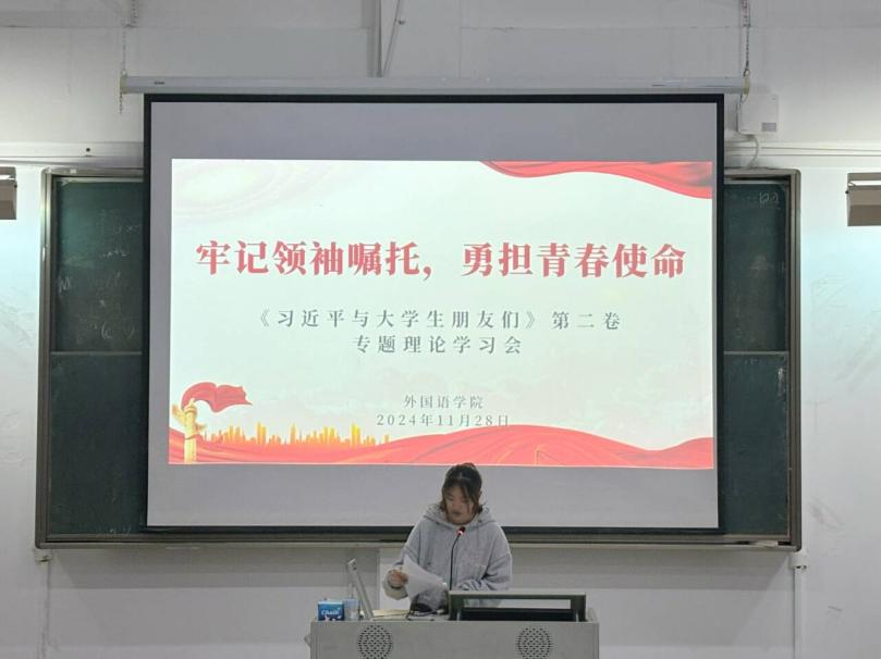 会上,翁云星老师领学了《习近平与大学生朋友们》第二卷中的访谈实录,深切讲述习近平总书记在地方和中央工作期间,深入高校调研考察、关心指导大学生的生动故事,共同领会习近平总书记薪火相传的“青年观”、念兹在兹的“青年情”、厚望重托的“青年志”。翁老师希望,同学们要把习近平总书记重要讲话的精神实质内化为提高自身理论水平的行动自觉,充分利用学校给予的平台,积极参加理论学习和社会实践,从多角度、多层次感受习近平总书记对大学生朋友们的谆谆教诲和殷切希望,勇于开拓创新,矢志艰苦奋斗,肩负起时代的使命和责任,将个人理想同国家的前途命运紧密结合起来。团委组织部副部长张可昕同学表示,作为新时代青年,要深刻领悟领袖嘱托,明确自己的时代定位与历史责任,勇于担当作为,将自己的小我融入祖国的大我之中,在新时代的征程中书写无愧于时代的青春篇章。
