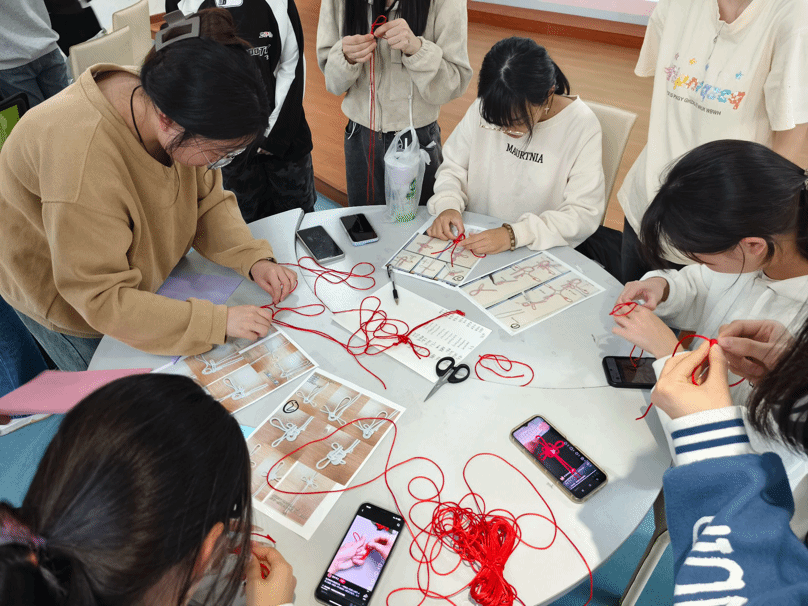 剪纸和中国结作为中国传统非遗项目,承载着深厚的民族智慧与文化内涵。活动现场,工作人员为同学们讲解了剪纸和中国结的历史渊源与艺术特点,并现场演示制作方法,从剪纸的图案设计、折叠技巧,到中国结的绳结编织、样式变化,让同学们对这两项传统技艺有了更深入的了解。在实践环节,同学们神情专注,认真对待每一个步骤,反复调整,与身边同学分享技巧与心得。剪刀在彩纸中穿梭,红绳在指尖缠绕,一张彩纸、一根红绳,翻转折叠间,寓意着幸福吉祥、寄托着美好祝福的剪纸与中国结便跃然眼前。