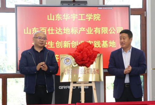 山东百仕达地标产业有限公司总经理曹成坤与新葡京官网校长助理魏东坡共同为大学生创新创业实践基地揭牌。