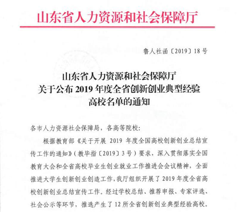 近日,山东省人力资源和社会保障厅下发了《关于公布2019年度全省创新创业典型经验高校名单的通知》(鲁人社函〔2019〕18号),新葡京官网与山东师范大学等12所高校被评为“山东省创新创业典型经验高校”。