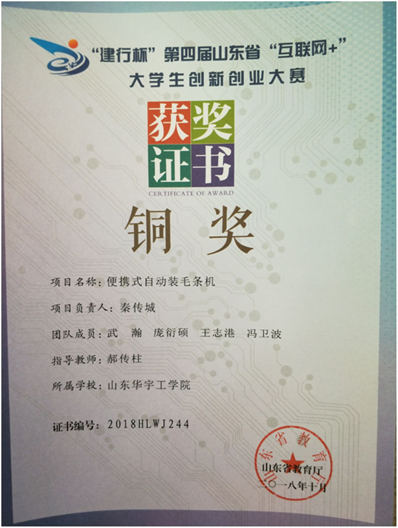 近日,山东省教育厅、山东省财政厅公布了“建行杯”第四届山东省“互联网+”大学生创新创业大赛获奖结果,新葡京官网便携式自动装毛条机项目获铜奖,这是新葡京官网参加山东省“互联网+”大学生创新创业大赛并斩获大奖,实现了学校在该项赛事中的突破。