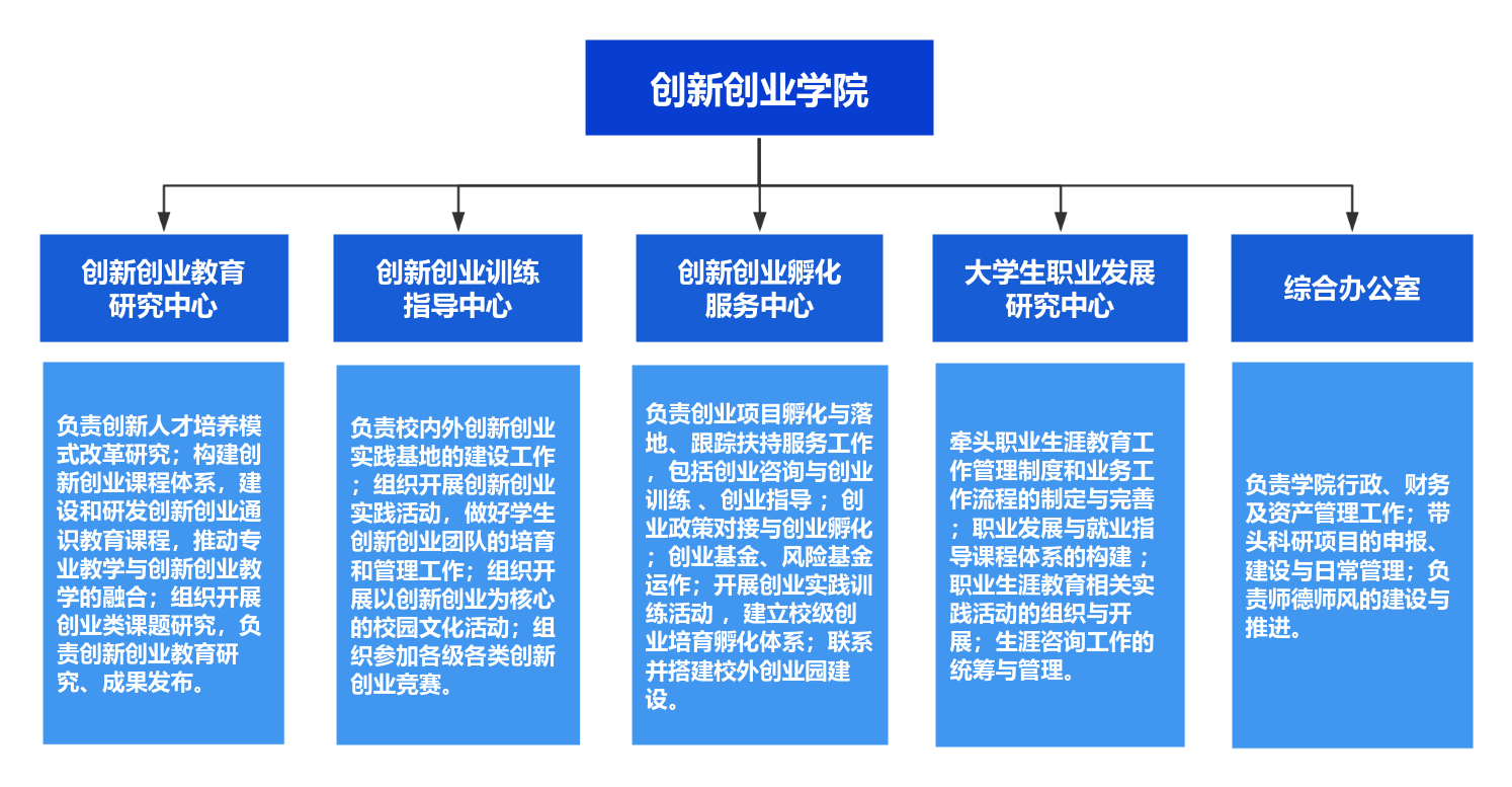 学校3003新葡的京集团具体负责落实学校的创新创业教育工作。3003新葡的京集团下设创新创业教育研究中心、创新创业训练指导中心、创新创业孵化服务中心、大学生职业发展研究中心、综合办公室。